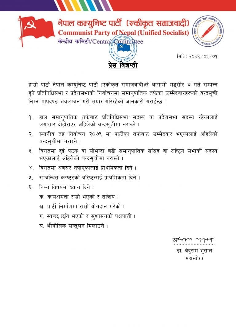 समाजवादीले शनिबार समानुपातिक उम्मेदवार छान्ने मापदण्ड सार्वजनिक गरेको छ। महासचिव डा. बेदुराम भुसालले समानुपातिक उम्मेदवार चयनको ६ वटा मापदण्ड तय गरेको जनाएका छन्।